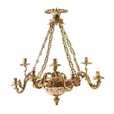 the cast corona and four chains supporting eight outscrolling arms above a painted porcelain base decorated with polychrome flower heads and moulded C scrolls, with a gilt metal drop pendant