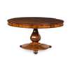 the circular top over a plain frieze above a facetted baluster column support, on a circular base raised on scroll feet with brass castors