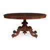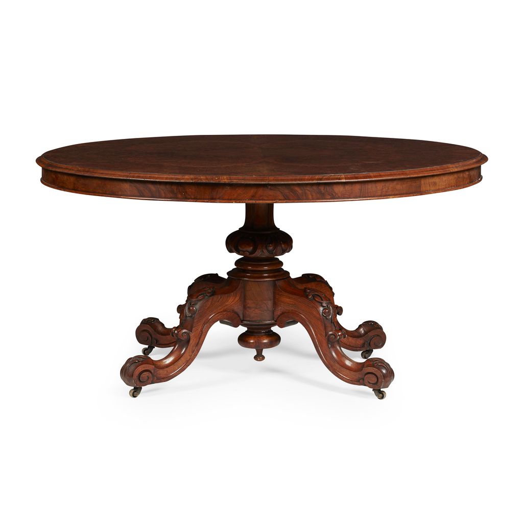 the quarter veneered oval top with a moulded edge, on a foliate carved column raised on foliate and scroll carved legs on brass castors