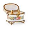 the oval hinged box painted with flower garlands and bouquets with gilt decorated borders, with scrolling brass loop handles and feet, opening to a pair of gilt decorated glass scent bottles