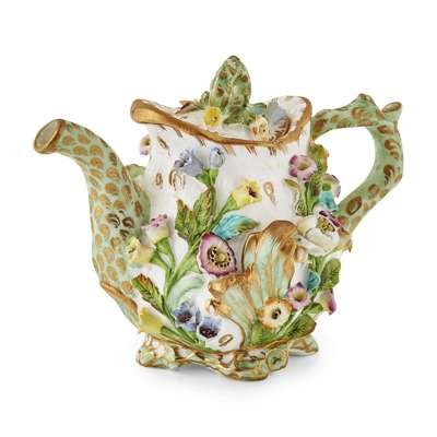 of lobed pear form with branch form handles and spout, the sides encrusted with flowers and leaves, enhanced with gilt details