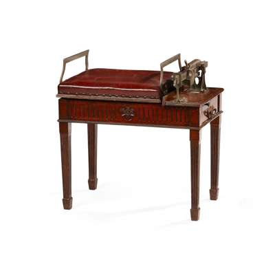 the brown leather padded seat and scales on a rectangular base raised on square fluted legs ending in spade feet