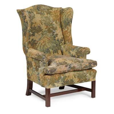 the arched back and wings above a loose cushion seat, raised on square legs joined by an H stretcher, in verdure tapestry upholstery