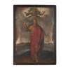 the standing figure holding a scroll in his left hand, his right hand raised in blessing, beneath the figure of God in Heaven, against a landscape within a black border