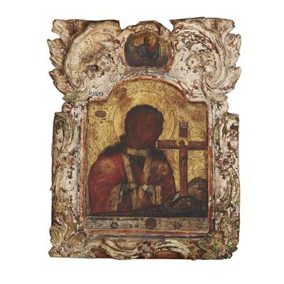 the arched panel painted with a waist length portrait of the saint in three quarter profile praying beside a crucifix set on the summit of Golgotha, against a gilt ground and beneath a smaller panel depicting Christ, in a frame deeply carved with C scrolls, flower heads, and foliate scrolls with traces of white and polychrome decoration