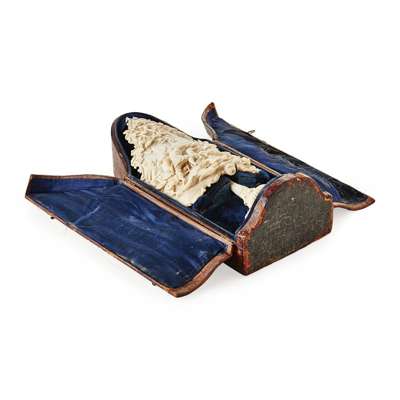 the curved panel carved in high relief depicting hunters, hounds and a stag , with a stand carved with hounds' heads, scrolled cartouches, acanthus, and shell motifs; in a blue velvet lined fitted leather case