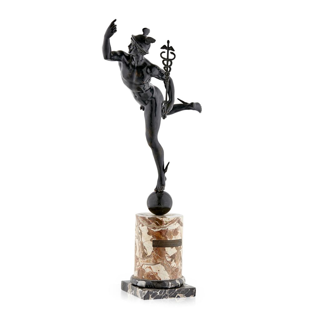 bronze, dark brown patina, raised on a spherical orb and turned marble column base