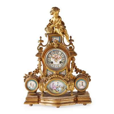 the circular porcelain dial with Roman numeral reserves and painted with putti against a bleu celeste ground, in a gilt metal rococo case hung with floral garlands and mounted with further porcelain plaques depicting Marie Antoinette, a musical couple, and floral sprays, surmounted by a figure of a child holding a basket of flowers, the eight day movement striking a bell; on a conforming moulded wood plinth