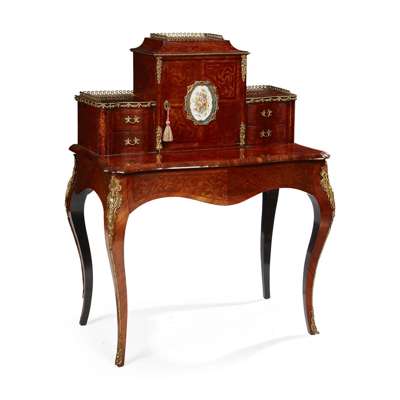 FRENCH KINGWOOD, AMARANTH, MARQUETRY AND PORCELAIN MOUNTED BONHEUR DU JOUR