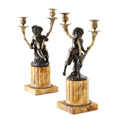 modelled as a bacchic girl and faun, each holding a pair of candle arms with urn form nozzles, raised on fluted Sienna marble columns with a square base, signed 'Clodion' (2)