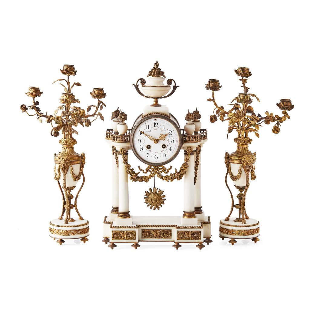 FRENCH WHITE MARBLE AND GILT METAL CLOCK GARNITURE