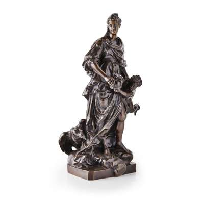 bronze, dark brown/black patina, the standing figure draped in classical robes and being handed a crown and sceptre by a putto