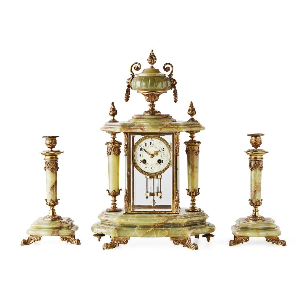 FRENCH ONYX AND GILT BRONZE MOUNTED CLOCK GARNITURE