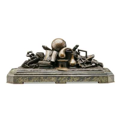 cast with various symbols to reflect the arts, industry and commerce, including an anchor, books, a medal and a globe inscribed EXP.TION UNIVERSELLE 1851, also inscribed to the base ATELIERS DESIR ET ARGUICHE, raised on an associated marble base