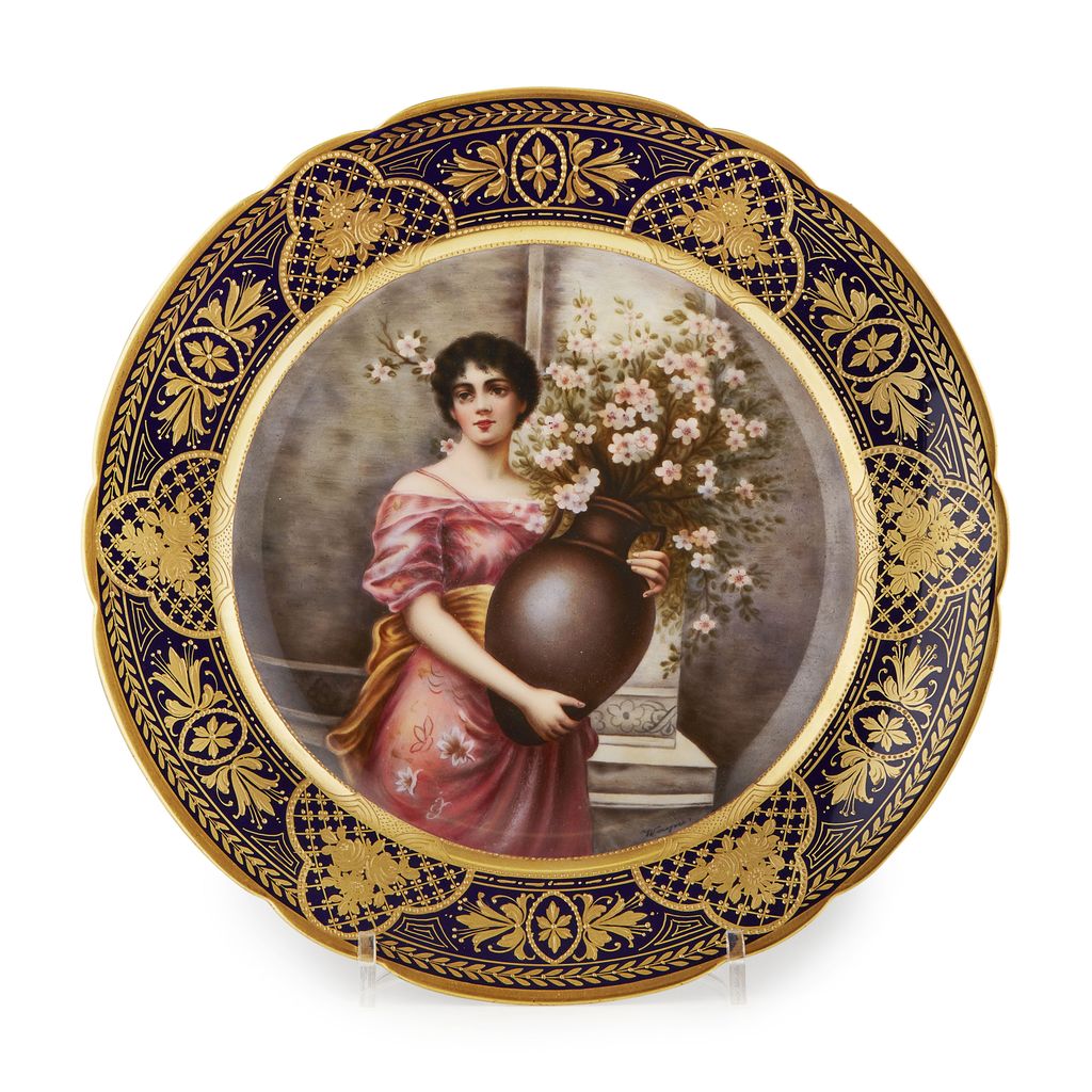 painted with a dark haired young woman holding an amphora filled with apple blossom, signed WAGNER, within a cobalt border with gilt highlights, with blue beehive mark and inscribed APFELBLÜTHEN