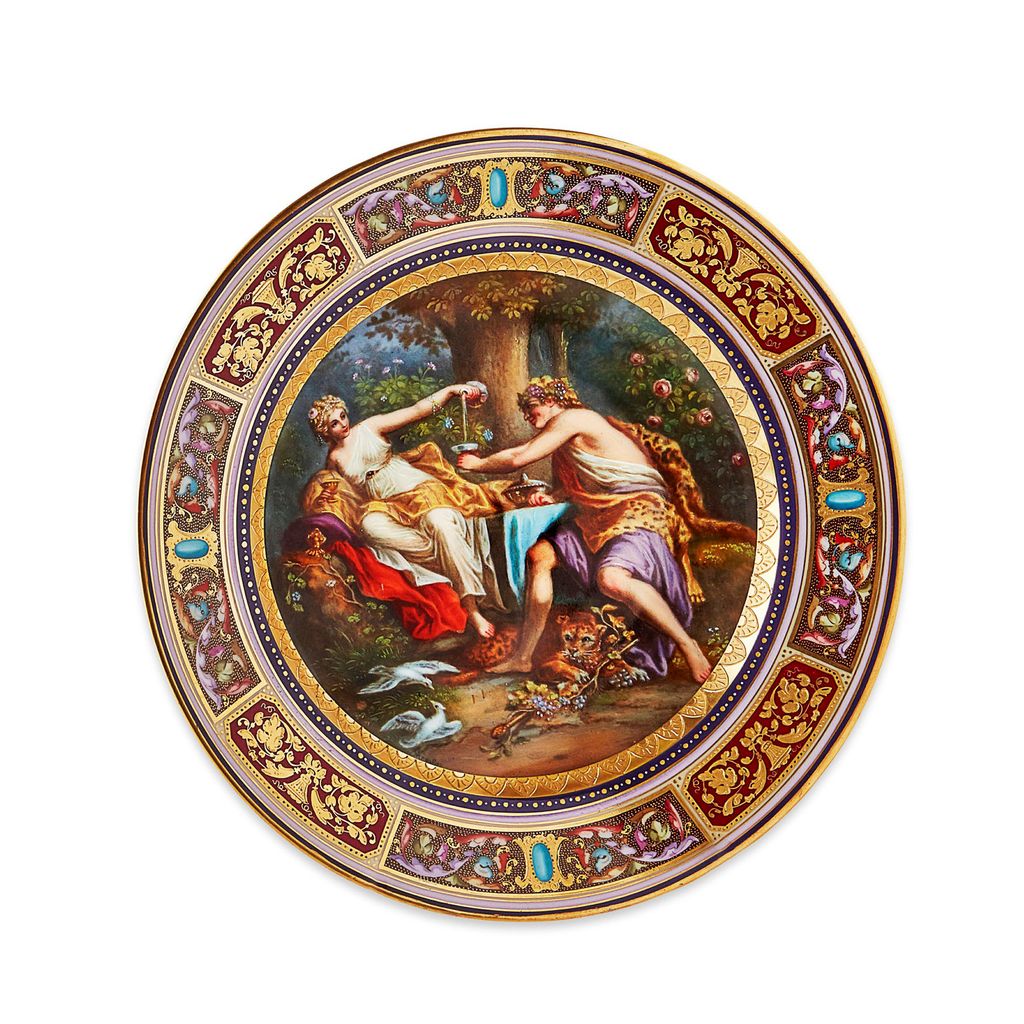 painted with Bacchus and Venus, signed L. KNOELLER, with a polychrome and gilt border, with blue beehive mark and painted title BACCHUS & VENUS