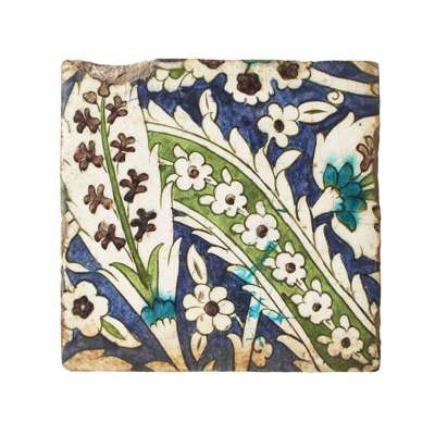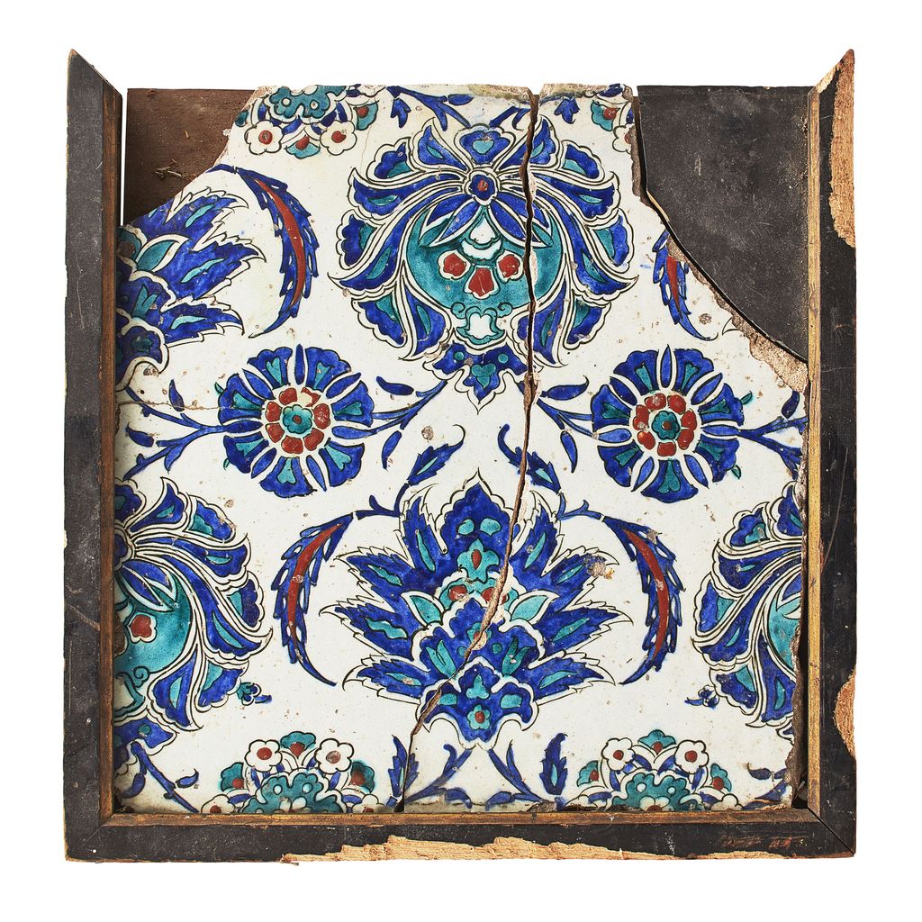 the fragmented tile painted in cobalt blue, iron red, black and turquoise with barbed leaves, lotus, plum blossom and chrysanthemum, in a distressed ebonised frame, 33cm x 35cm; together with an IZNIK tile painted in cobalt blue, green, black and aubergine with barbed leaves and hyacinths, 22.5cm x 22.5cm (2)