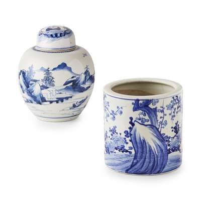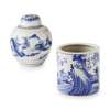 the shaped rim and panelled body decorated with figures playing games and instruments, within ornate borders depicting birds and foliage, 25.5cm wide; together with JAPANESE BLUE AND WHITE JARDINIERE, 19cm high; and a CHINESE BLUE AND WHITE COVERED GINGER JAR, 26cm high (3)