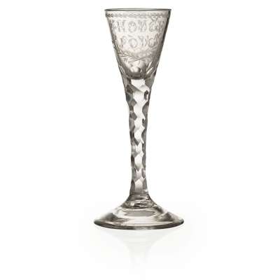 the funnel bowl etched in capitals 'HODGE PODGE' and the date '5 MAY 1752' within laurel wreaths, on a facet cut stem and circular domed foot
