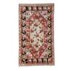 the red field with pistachio elongated medallion, light blue spandrels, within brown floral border