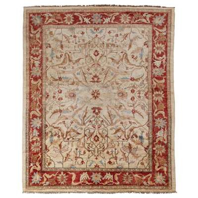 the 'abrash' light camel field with allover palmette and foliate pattern, within rust red palmette and vine border