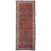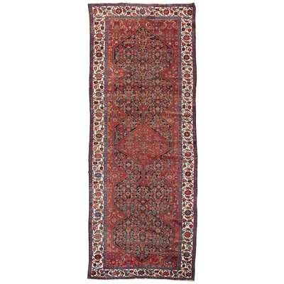 the dark indigo field with red lozenge medallion and similar half medallion sides, within ivory rosette and vine border