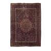 the red field with salmon pink and polychrome medallion, blue and pink spandrels, within indigo palmette and vine border, inscription to one end