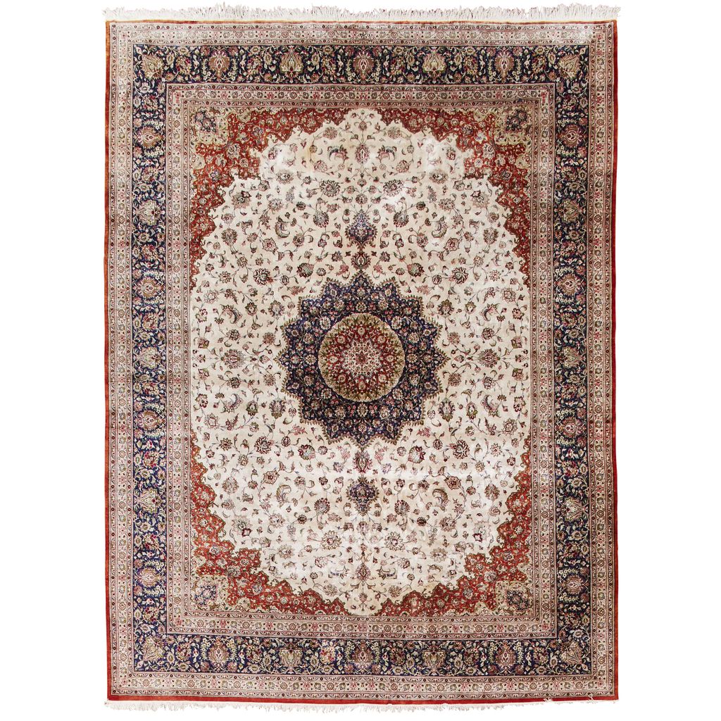 the cream field with indigo and polychrome border, rust and olive spandrels, within indigo palmette and vine border, inscription cartouche to one end