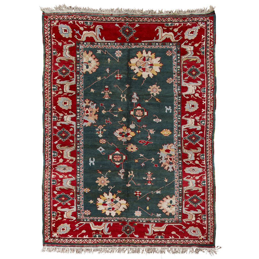 the green field with palmette and foliate vine pattern, within red palmette and arabesque border