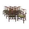 comprising ten side chairs and an armchair, with serpentine top rails above pierced interlaced splats, over green leather upholstered stuffover seats, raised on straight square moulded legs joined by H stretchers (11)