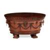 the hinged oval top opening to a lead lined interior, the tapered oval sides carved with husk swags, rosettes, and satyr masks, with brass lion mask handles to the ends, raised on waisted block feet