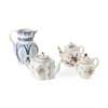 comprising a large Worcester bullet form example with a flower bud finial, decorated with Chinese figures, with a white metal mounted spout, 17cm high; a smaller teapot of similar shape decorated with flower sprigs and sprays, with a paper label for the CECIL C. SMITH COLLECTION, 15.5cm high; and a New Hall silver form teapot decorated with flower sprigs, sprays and swags, with painted number N241, 16cm high; together with a WORCESTER BLUE AND WHITE MOULDED JUG, with cabbage leaf moulding, 23cm high (4)