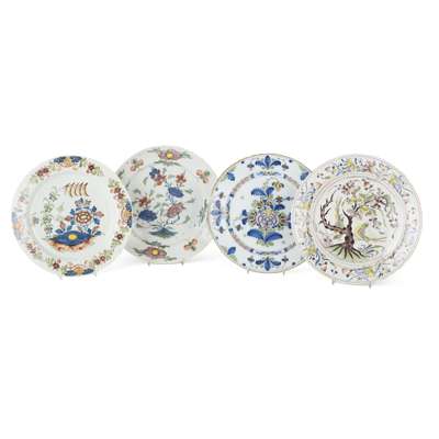 FOUR DELFTWARE POLYCHROME CHARGERS