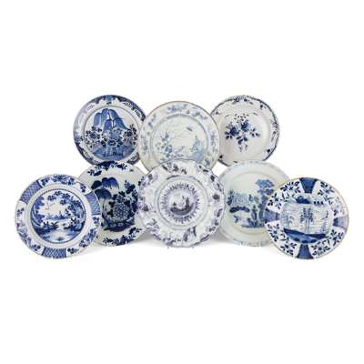 EIGHT DELFTWARE BLUE AND WHITE CHARGERS