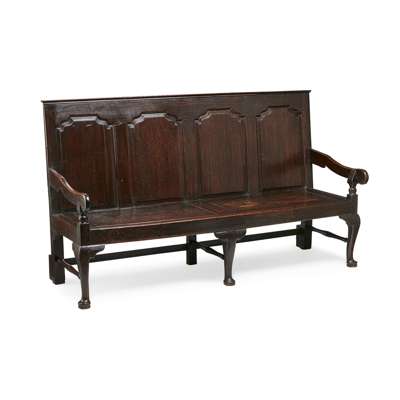the moulded cornice above a quadruple moulded panel back and open scroll arms, the long double panel seat raised on cabriole legs joined by stretchers