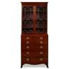 the moulded cornice above a pair of astragal glazed doors opening to shelves; the lower part with a secretaire drawer opening to a satinwood interior fitted for writing, over three further long drawers and a shaped apron, raised on splayed feet