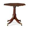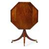 the crossbanded octagonal tilt top on a square tapered column and four outswept legs ending in brass caps and castors