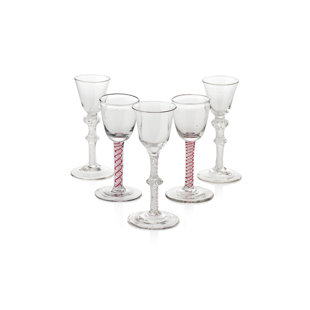 comprising a pair of air twist wine glasses with knopped stems, 15cm high; two wine glasses with red and white spiral inclusions to the stems, 14.5cm high; and a wine glass with white spiral inclusions to the stem, 15.5cm high (5)