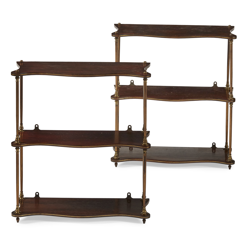 PAIR OF REGENCY ROSEWOOD AND BRASS HANGING SHELVES