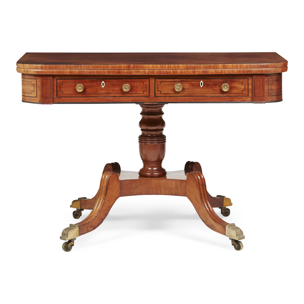 REGENCY MAHOGANY, ROSEWOOD AND EBONY FOLDOVER TEA TABLE