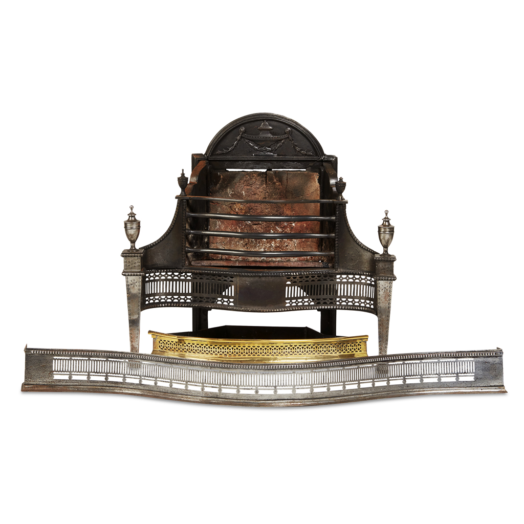 the arched back plate cast with an urn, the serpentine pierced apron and square tapered supports with punched decoration and urn finials; with a serpentine pierced steel fender; together with a PIERCED BRASS ASH PAN (3)