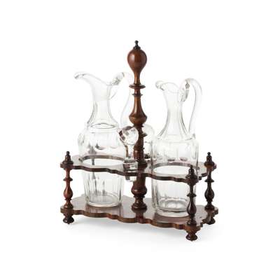 of lobed outline with two tiers united by turned columns and a handle, containing a pair of cut glass decanters and stoppers