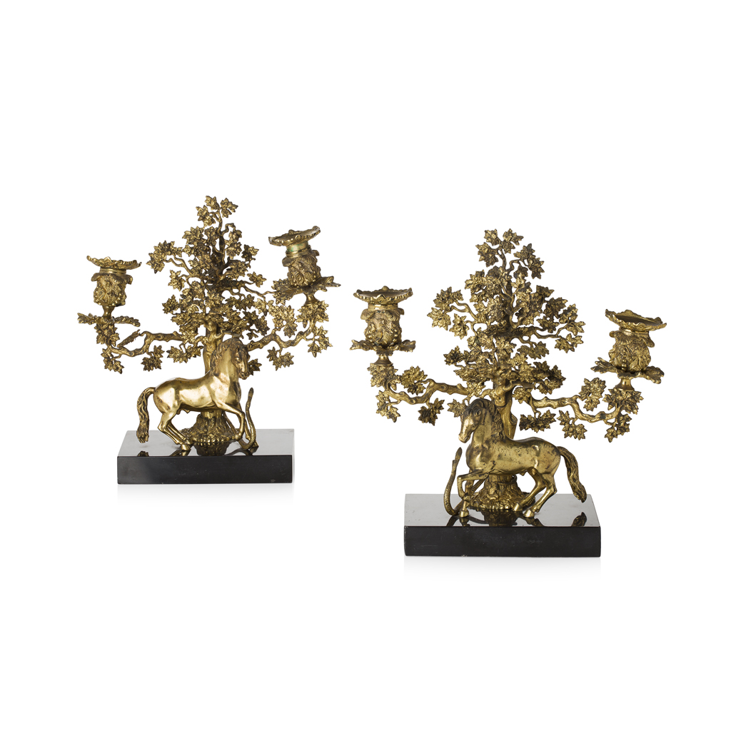 each with a horse and serpent beneath an oak tree, the tree branches forming twin candle arms, on black marble bases (2)
