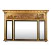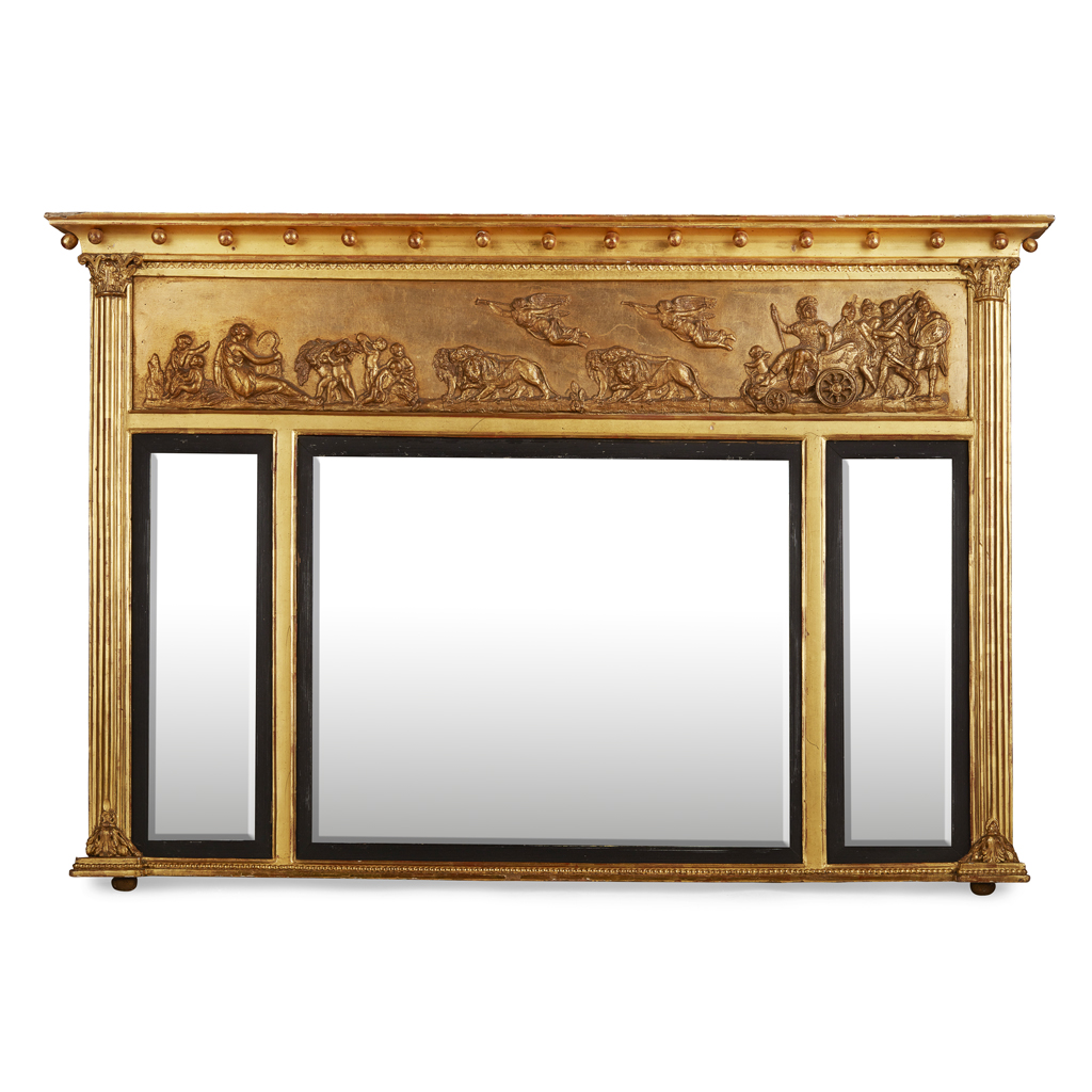 the inverted breakfront cornice above a frieze depicting Apollo in a chariot pulled by lions above triple bevelled mirror plates in ebonised slips, flanked by columns