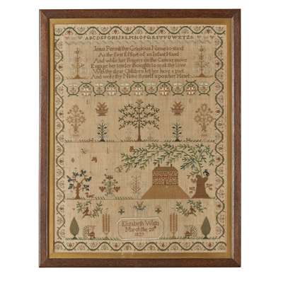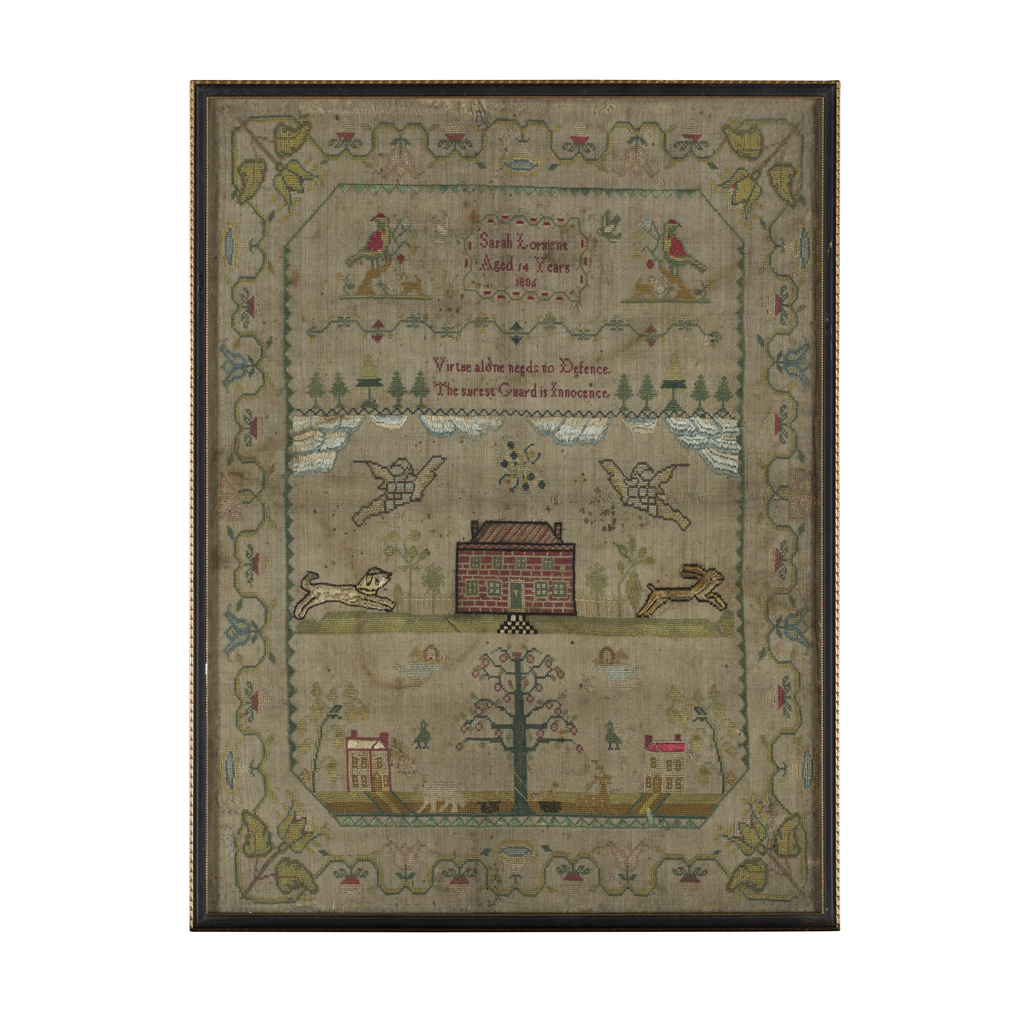 the first by ELIZABETH WATTS / MARCH 25TH/ 1829, with a religious quotation above a house, trees, and animals, 44 x 33cm; the second by SARAH LORMENT/ AGED 14 YEARS/ 1806, with a religious quotation above a house, buildings and animals, within floral borders, 41.5 x 31cm (2)