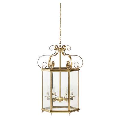 the hexagonal brass frame with glass panels and a six branch electrified fitting