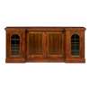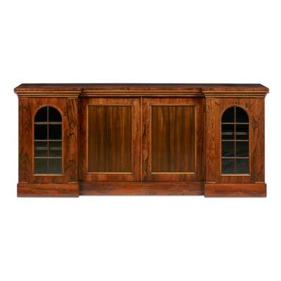 of inverted breakfront outline, with a pair of moulded cupboard doors flanked by arched and glazed doors open to shelves, on a conforming plinth base