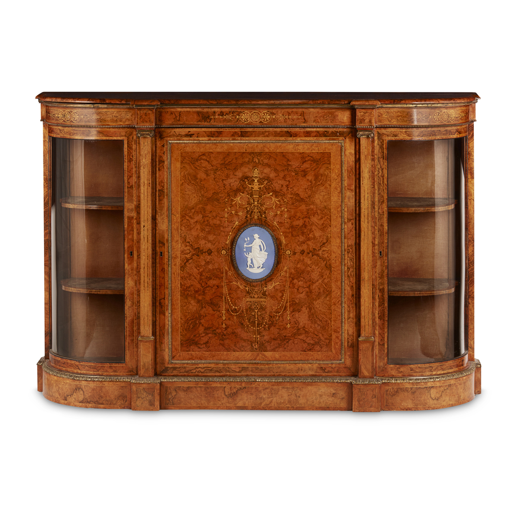 VICTORIAN BURR WALNUT, INLAY, AND JASPERWARE MOUNTED CREDENZA