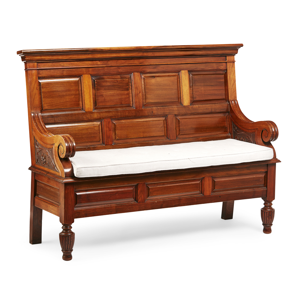 the moulded panel back above scrolling enclosed arms with foliate carved panels, above a panelled base raised on turned and reeded baluster legs, with a modern cushion seat pad