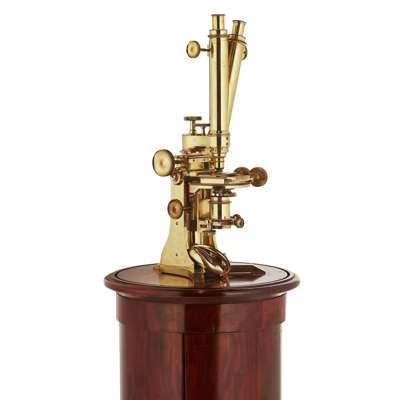 VICTORIAN BRASS BINOCULAR MICROSCOPE AND DISPLAY PEDESTAL WITH DOME